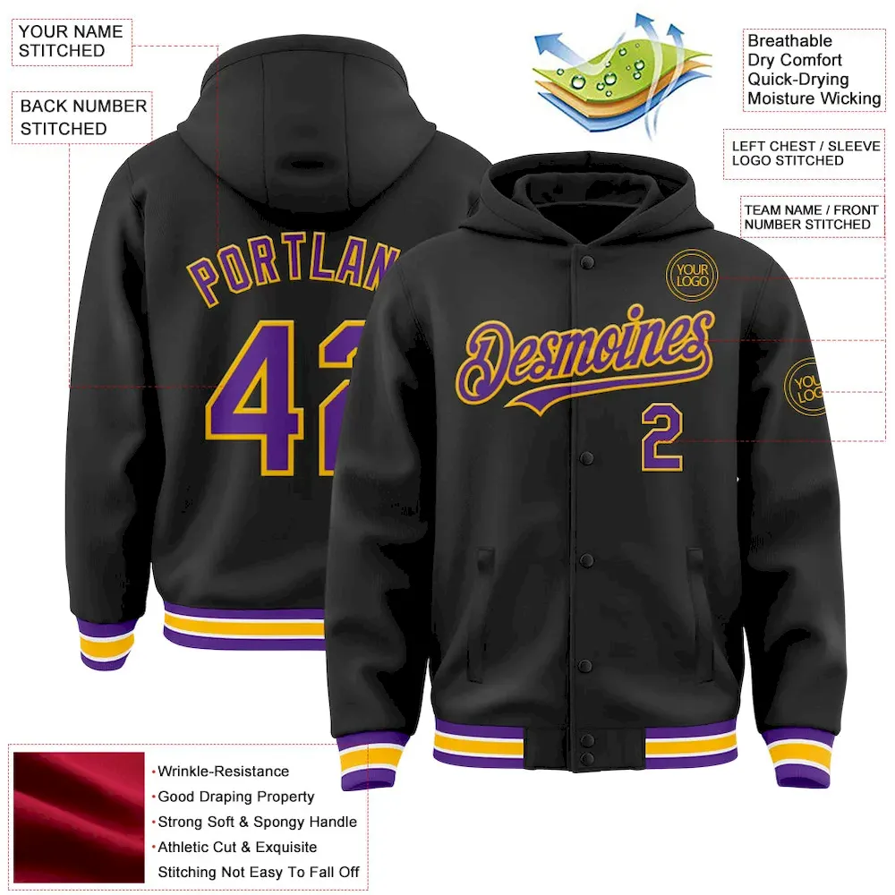 Custom Black Purple-Gold Bomber Full-Snap Varsity Letterman Hoodie Jacket