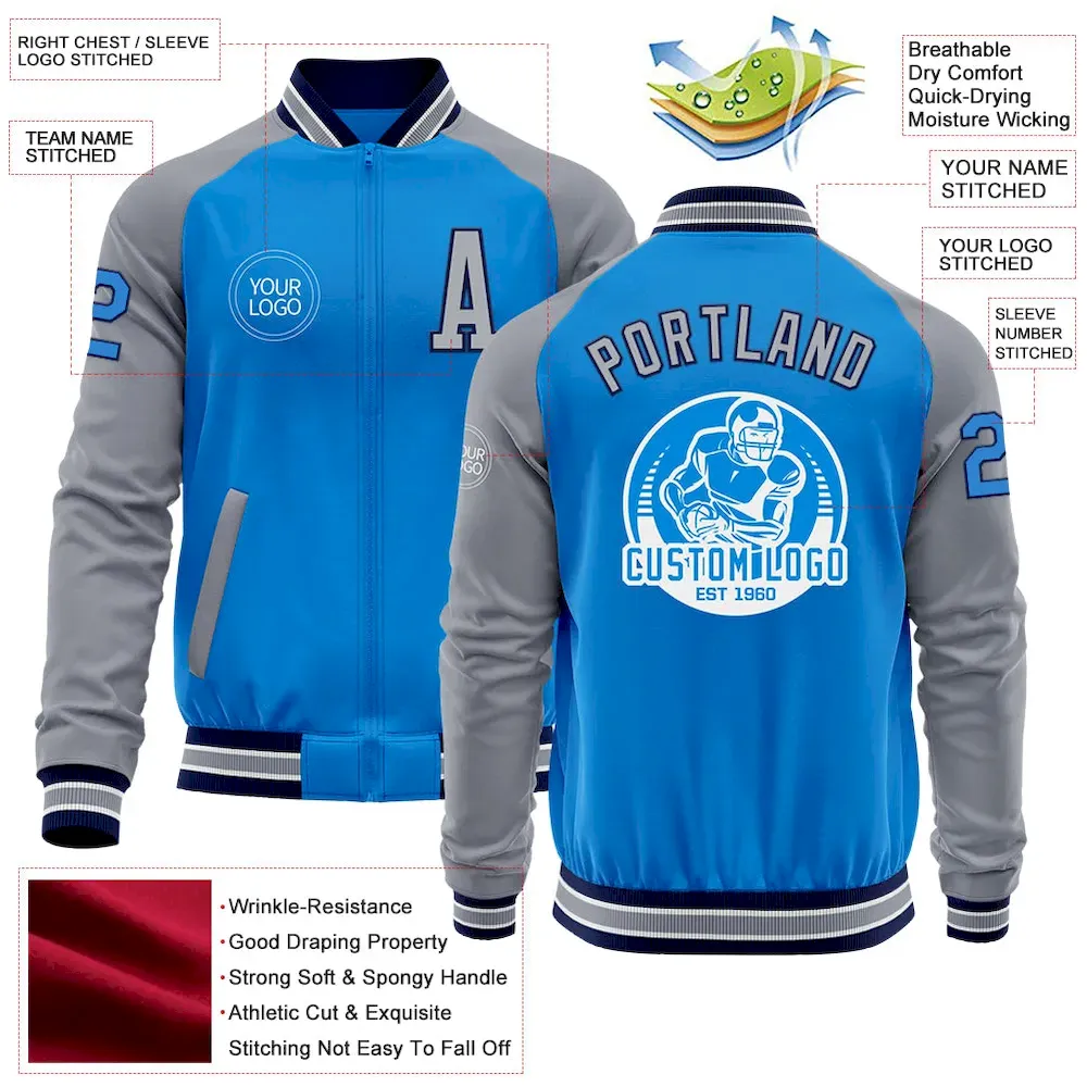 Custom Powder Blue Navy-Gray Bomber Varsity Letterman Two Tone Zipper Jacket