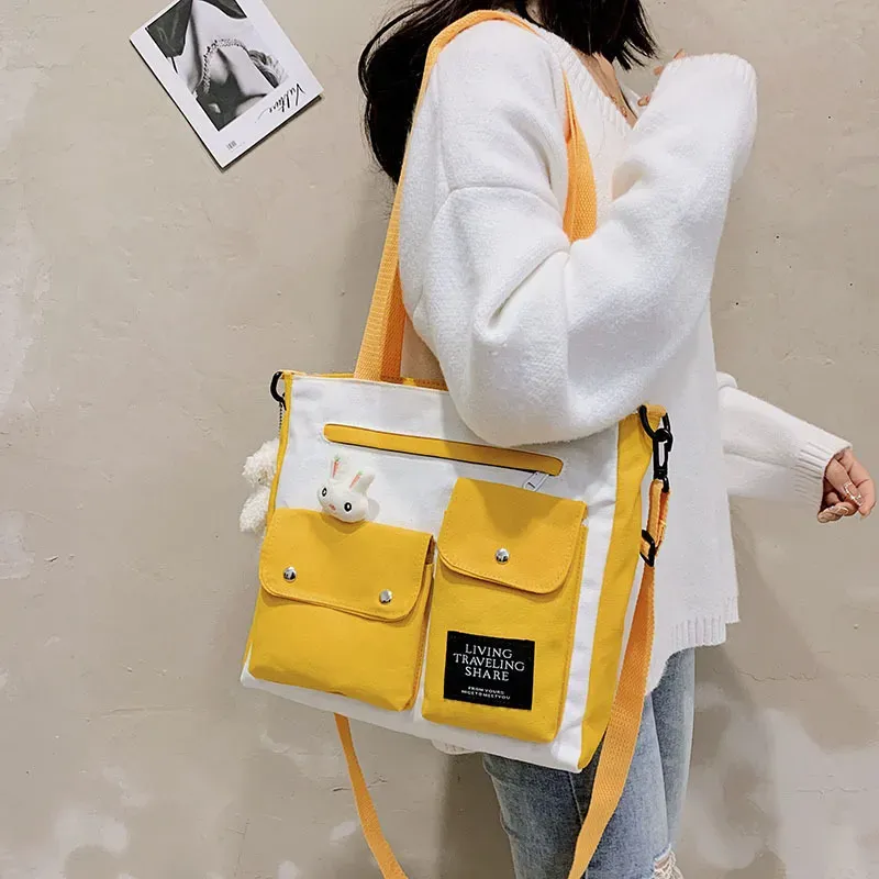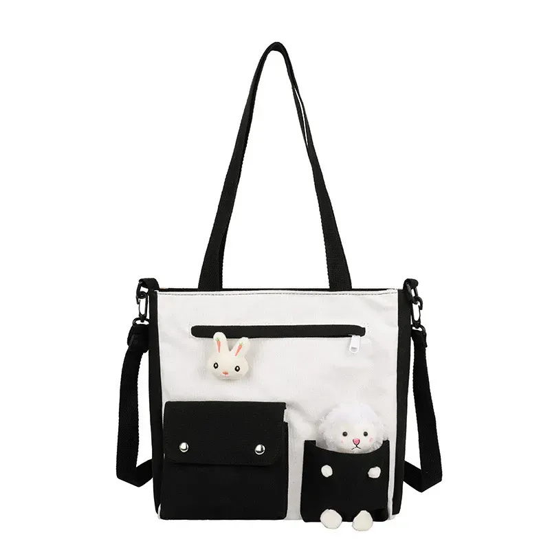 Women Cute Cartoon Doll Decoration Pocket Design Color Blocking Canvas Shoulder Bag